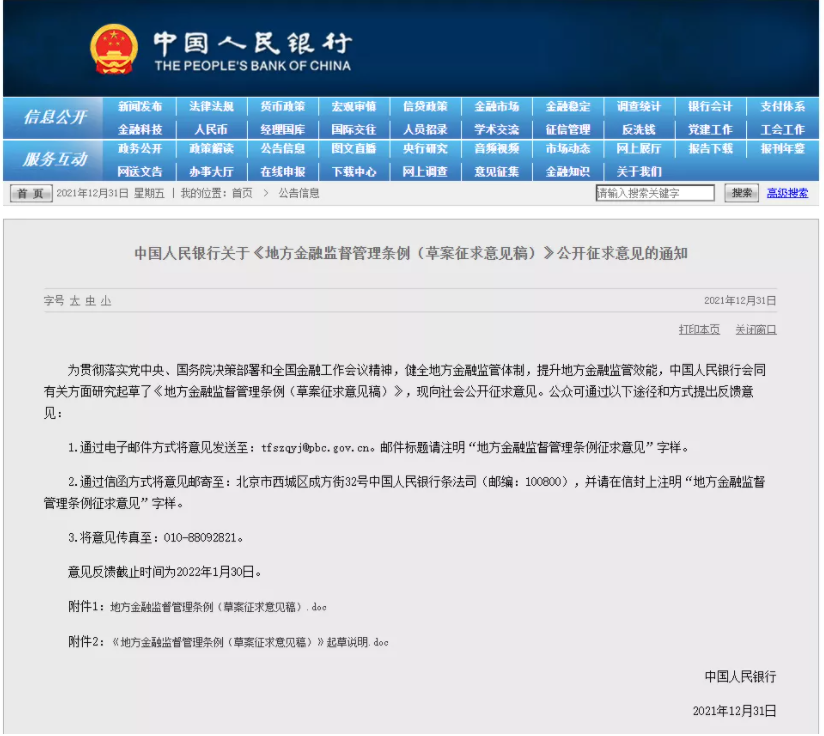 12月31日,央行就《地方金融监督管理条例(草案征求意见稿)》公开征求意见。